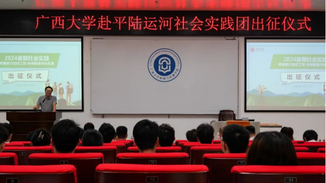 出征仪式现场,新闻与传播学院党委书记银健老师发表讲话。他指出,党的二十届三中全会出台了《中共中央关于进一步全面深化改革、推进中国式现代化的决定》,而平陆运河工程作为广西壮族自治区在推动中国式现代化、壮美广西建设中的一项重要举措,受到了中央、自治区和学校的高度关注。贝博官网四院联合组织的此次暑期社会实践活动,正当其时、恰逢其势,将为推动平陆运河工程的建设与发展贡献青春力量。银健书记强调,在实践过程中,团队成员应牢固树立安全意识、专业意识、问题意识和成果意识,真正做到受教育、长才干、做贡献,将青春的汗水和智慧的火花挥洒在壮丽的广西建设之中,为推进中国式现代化的伟大征程贡献力量。