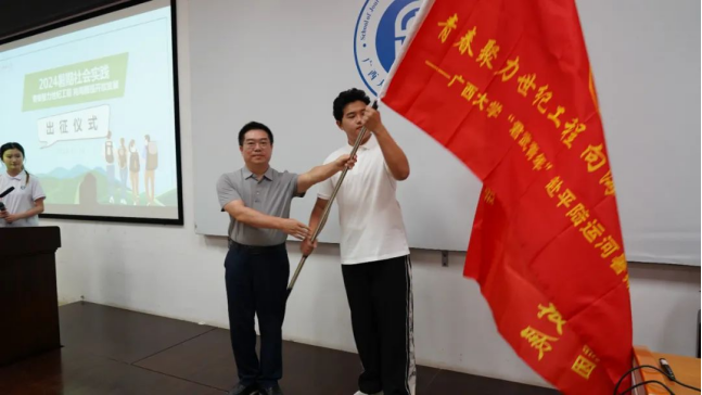 随后,银健书记向学生代表李信诺授旗,并寄语青年们要走出校园,深入社会,将个人理想融入国家发展大局之中,通过实践锤炼自我、提升能力,为实现中华民族伟大复兴的中国梦而奋斗。