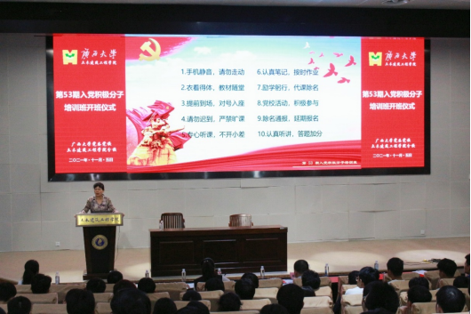 11月5日下午,bb贝博betball官网登录党委党校bb贝博betball官网登录分校第53期入党积极分子培训班开班仪式在新结构实验平台综合楼报告厅举行。学院党委书记戴永恒、党委副书记秦建丽出席开班仪式。开班仪式由潘桂祯老师主持,第53期入党积极分子培训班全体学员与会。