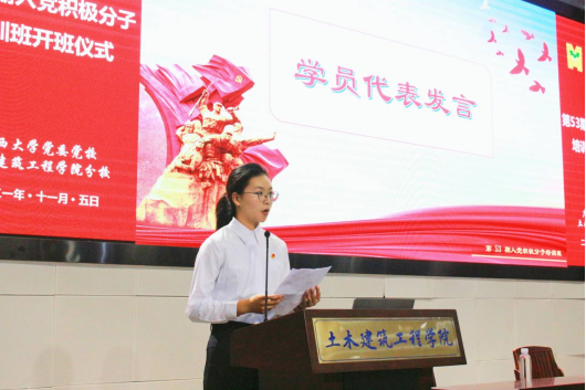 随后,培训班学员、2021级本科生张钰研作为学员代表发言。她认为,站在两个一百年的历史交汇点上,我们作为时代新人要继承和发扬伟大建党精神,坚定理想信念,以切实的行动提高自身素养,在实现中华民族伟大复兴中国梦的新长征路上奋勇搏击。她向全体学员倡议:时刻以一个优秀共产党员的标准来要求和鞭策自己,不断完善自己,发挥党员先锋模范带头作用,在实践中与党同心、与人民同行,将青春融入祖国山河之中。