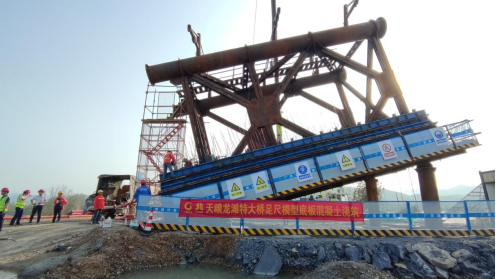bb贝博betball官网登录大跨拱桥关键技术研究团队在郑皆连院士的带领下围绕劲性骨架外包高性能混凝土的性能设计与调控持续开展科技攻关,研发了抗裂自密实高性能混凝土及工程环境条件下基于混凝土浇筑节点工作性能精准控制的混凝土施工密实性保障技术,并应用于天峨龙滩特大桥管内和外包混凝土。为保障天峨龙滩特大桥的建设,天峨龙滩特大桥项目部联合bb贝博betball官网登录、清华大学等高校研究团队,取实桥第12节段设计了大桥足尺模型,并开展管内混凝土灌注与外包混凝土浇筑试验,以检验混凝土性能设计、制备技术与施工方案。