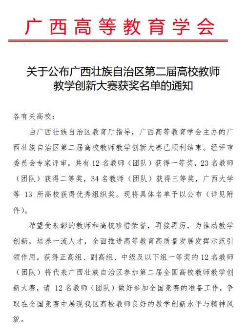 近日,广西高等教育学会公布了广西壮族自治区第二届高校教师教学创新大赛获奖名单,贝博官网党委书记陈正教授带领的《土木工程材料》教学团队获正高组一等奖,并获推荐参加全国竞赛。