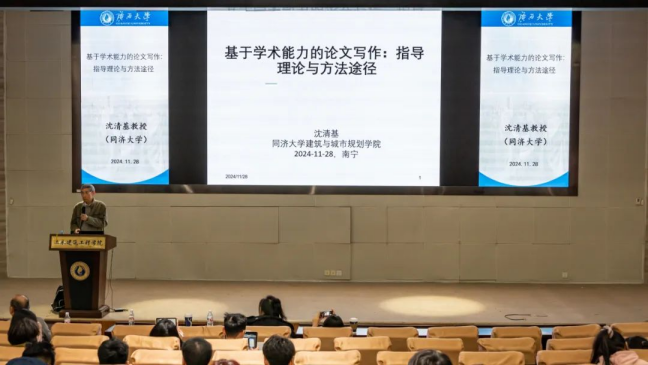 随后,沈清基教授从学术论文的定义、学术论文的本质、学术写作的指导理论、提升写作的途径等几个方面,讲述了如何去完成一篇优秀的学术论文。他引用唐代诗人陶渊明的名句——“勤学如春起之苗,不见其长,日有所增;辍学如磨刀之石,不见其损,日有所亏。”告诫学子,作为初学者,一定要做到论文的准确性,同时也要做到简明性和规范性。